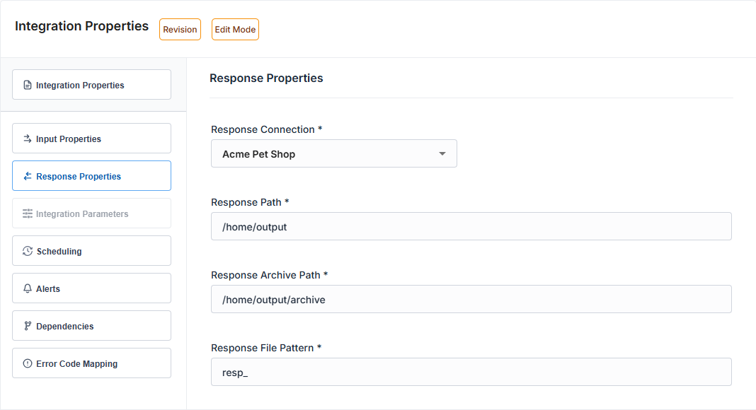 Property Name Property Description Response Connection Select Acme Pet Shop S3 Connection.Response Path Type /home/output/. 1Response Archive Path Type /home/output/archive/. 1Response File Pattern Type resp_${input}.csv. 3 -
