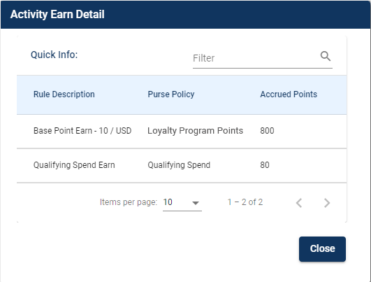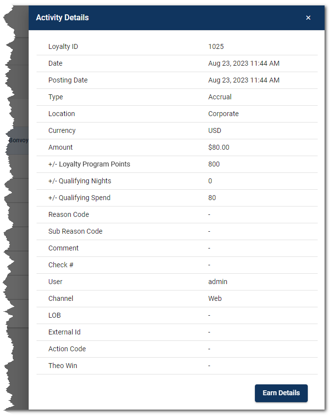 Clicking Earn Details on the Activity Details pane opens the Activity Earn Detail dialog box displaying the earn rules for a transaction.