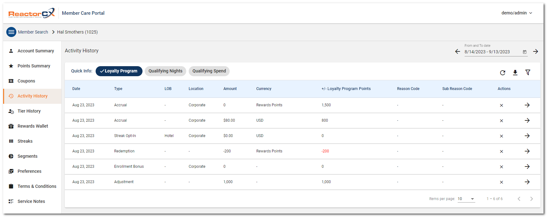 The Activity History view shows loyalty accrual activity details resulting from a member’s recent purchase and non-purchase activities.