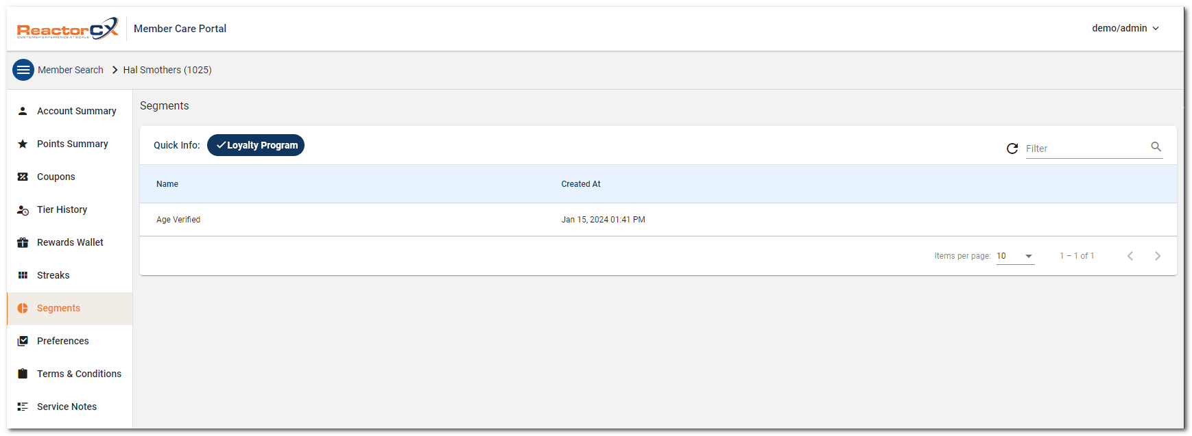 The Segments view shows the segments the current member belongs to.