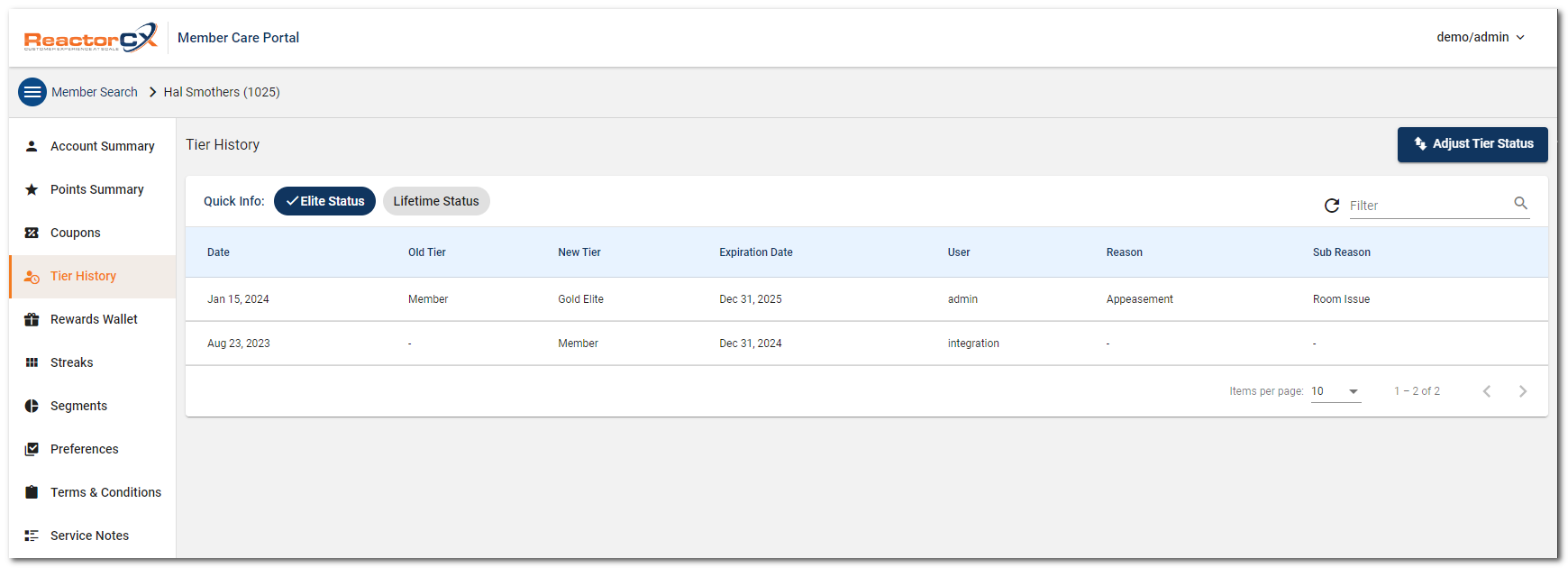 You can change a member's tier by clicking Adjust Tier Status.