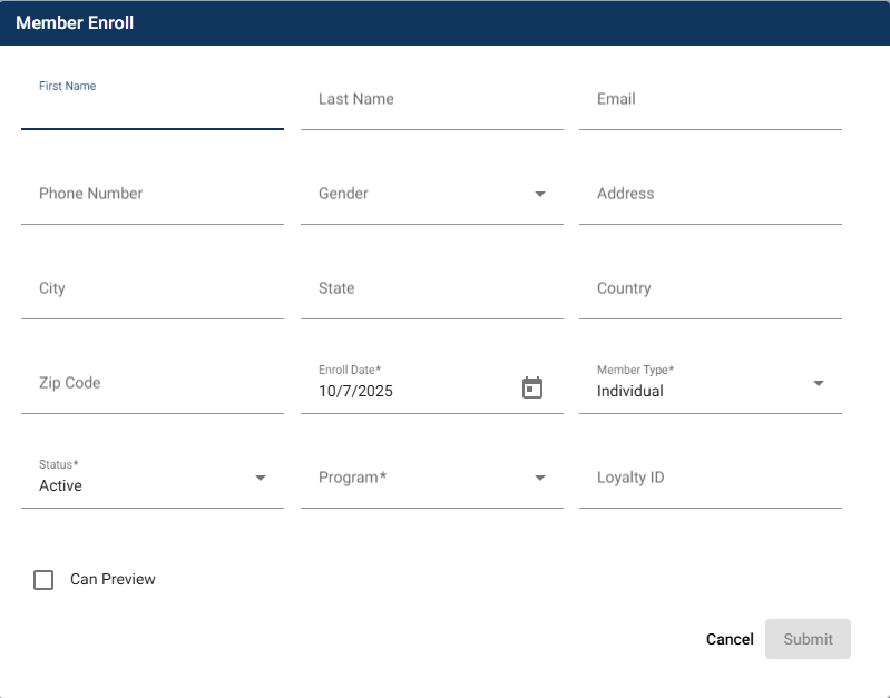- The date the member is enrolling in the loyalty program. The current date is entered by default.