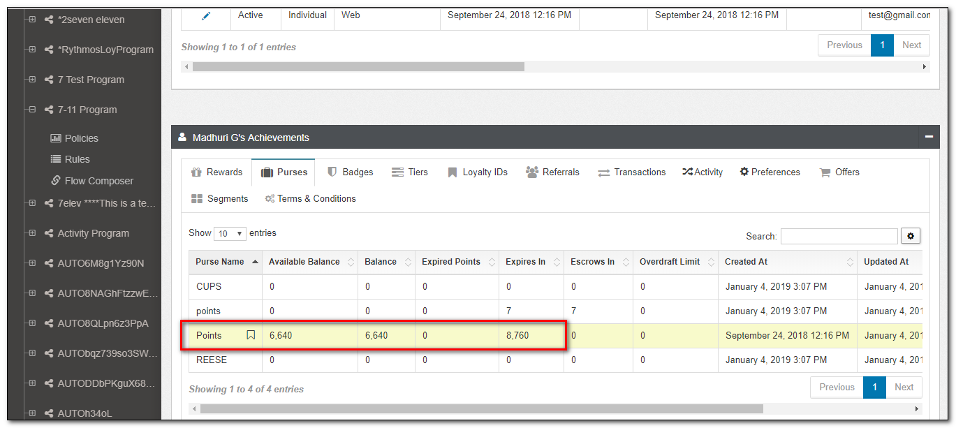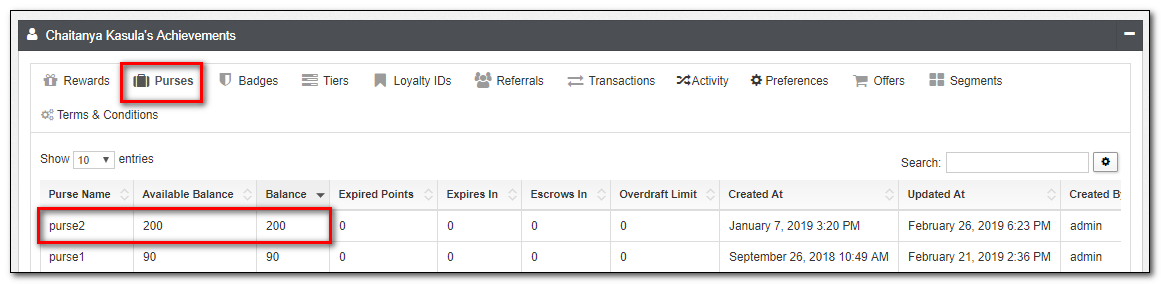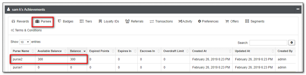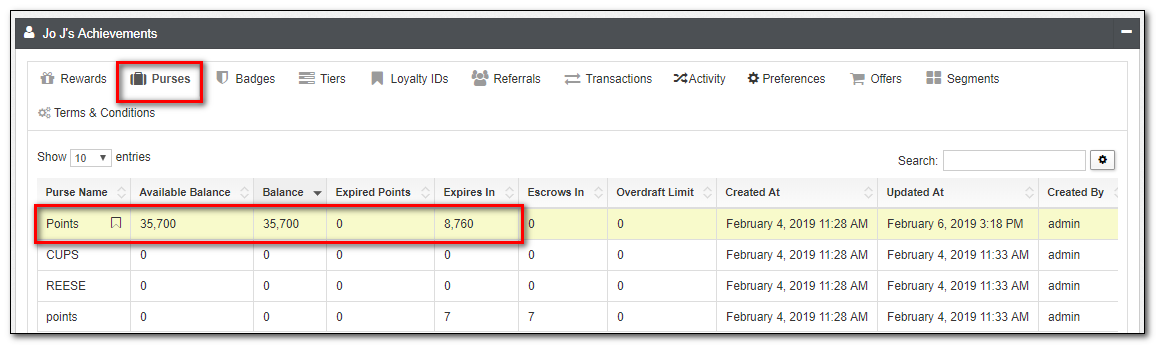 | Purses | A list of all Purses, including available balances, expired points, escrow, and expiration information are visible here. Purses are accounting objects, therefore, can not be directly altered here. Enter an Activity within the Activites tab to change a Purse. |