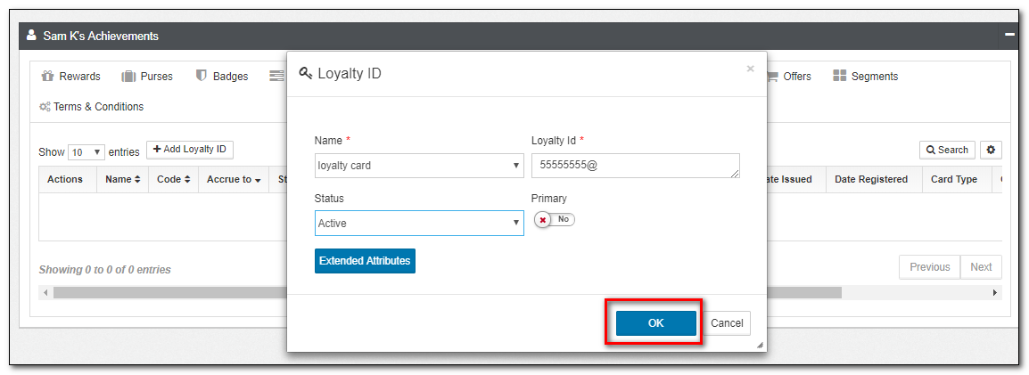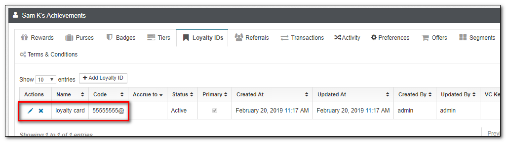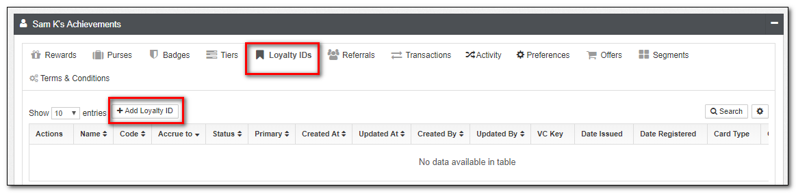 | Loyalty IDs | The list of all Loyalty IDs associated with a member, such as cards, alternate IDs such as phone numbers, etc. The Loyalty IDs can be edited from this view. |