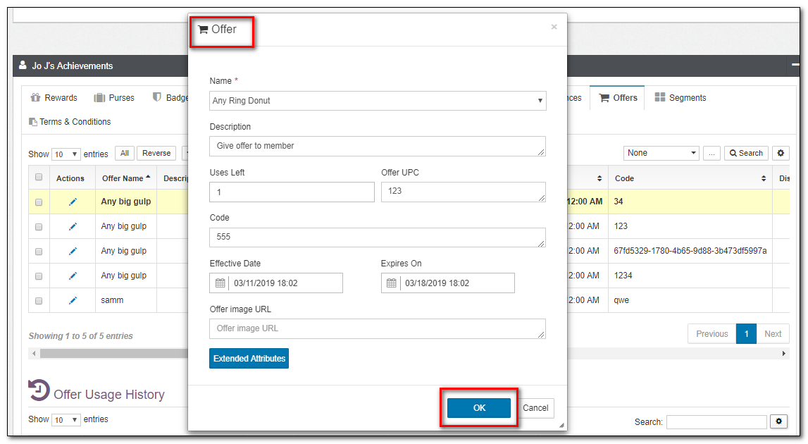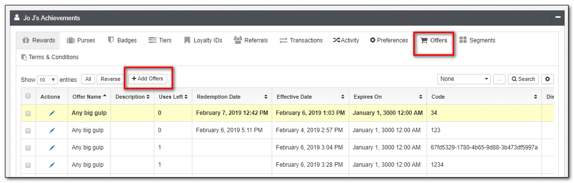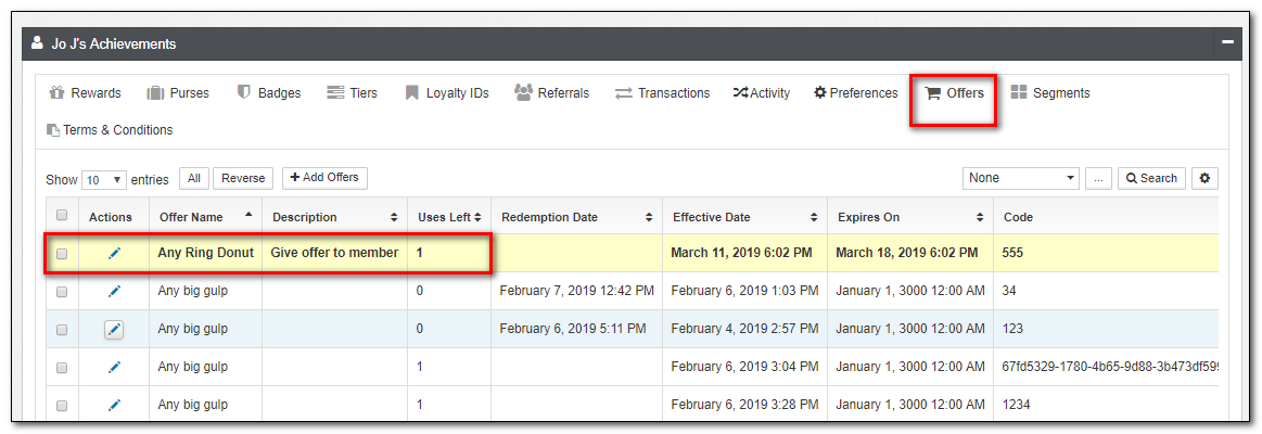 | Offers | This is a list of member Offers, expiration status, as well as uses left. Offers can manually be edited from this view. |