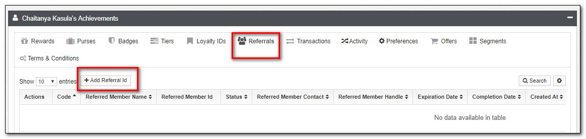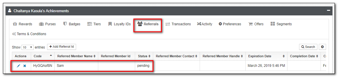 New Referral Id gets generated under the code with the code status as Pending.