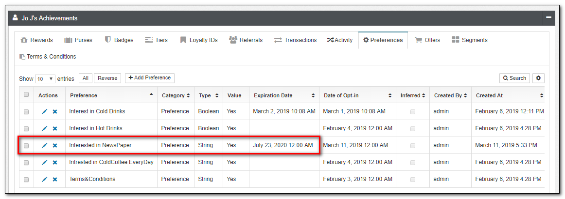 | Preferences | This is a list of preferences for a member. Preferences can be edited from this view. |