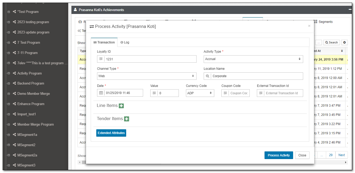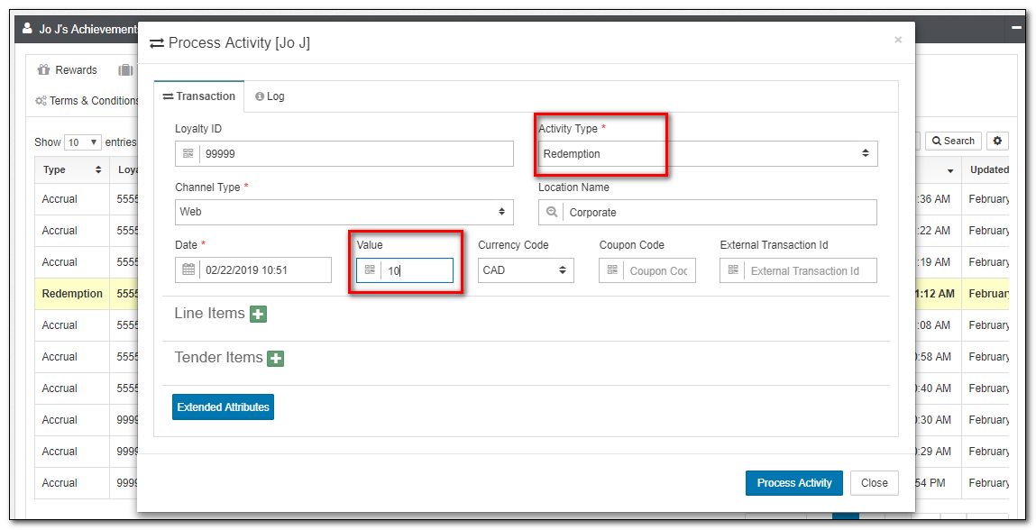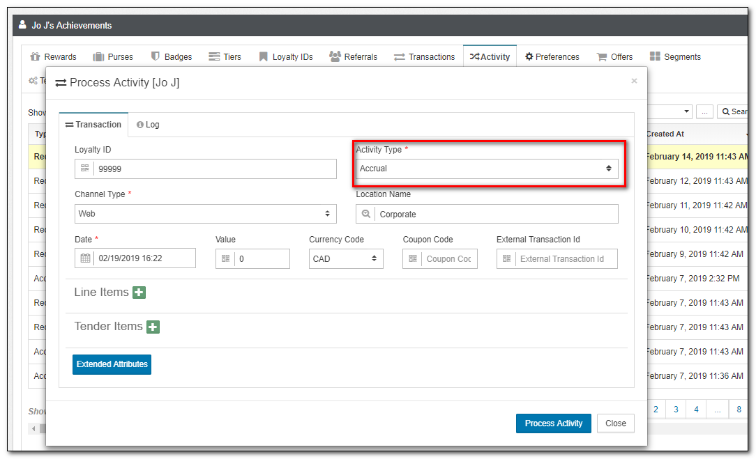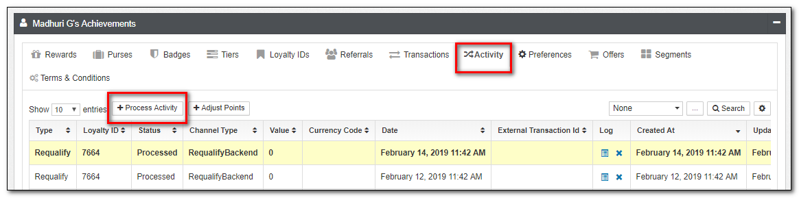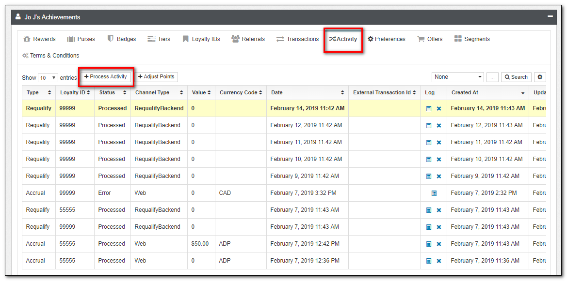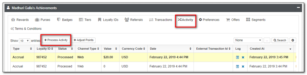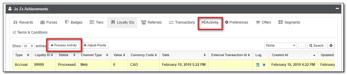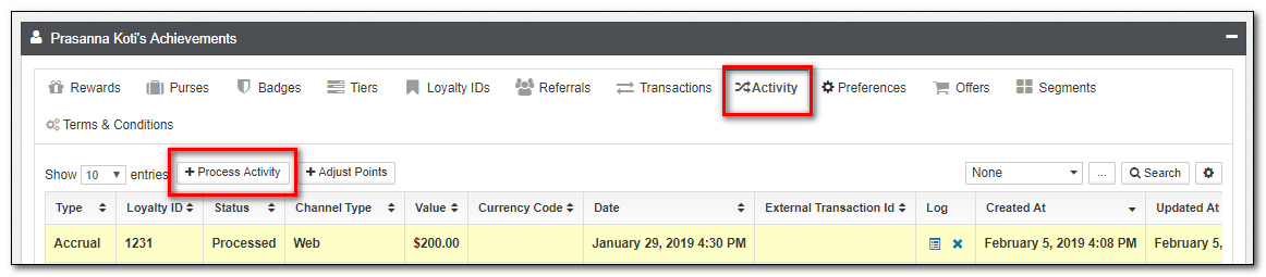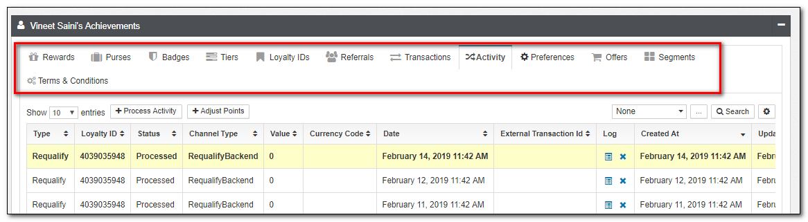 | Activity | This is an alternate view of transactions, with a focus on Loyalty Activity such as Accruals and Redemptions. While you can not directly modify Activities, you can submit new Activities from this view. |