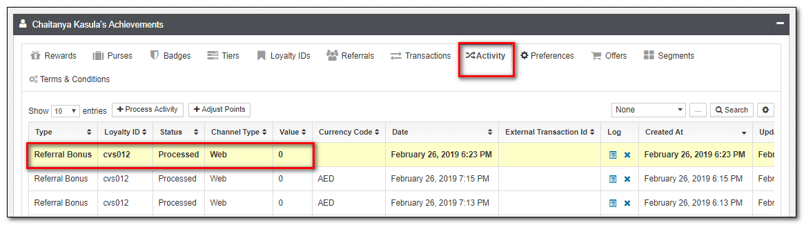 7.Click the Activity Applet tab to check the Referral Bonus activity.