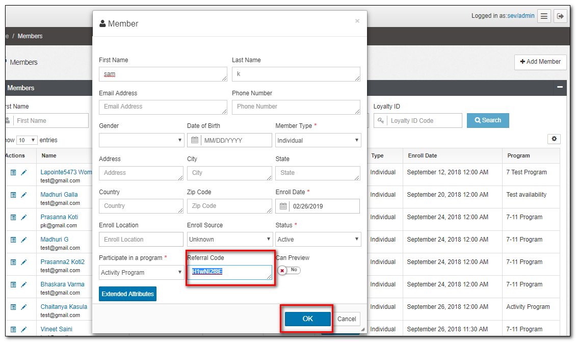 5.Add the New Member to the Program with the above generated Referral Code. Click on OK or Cancel to confirm or discard your changes.