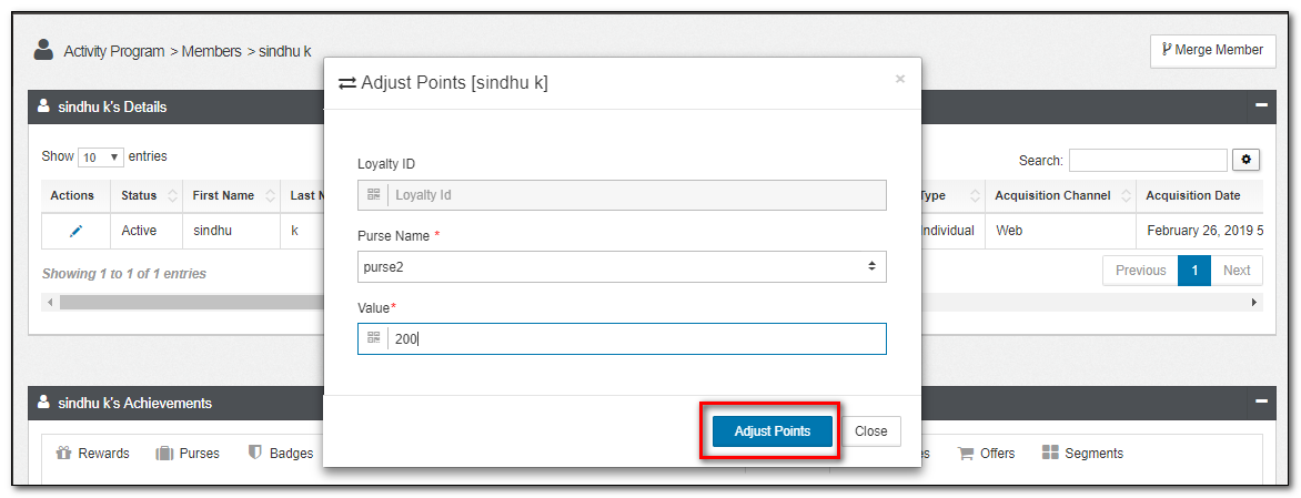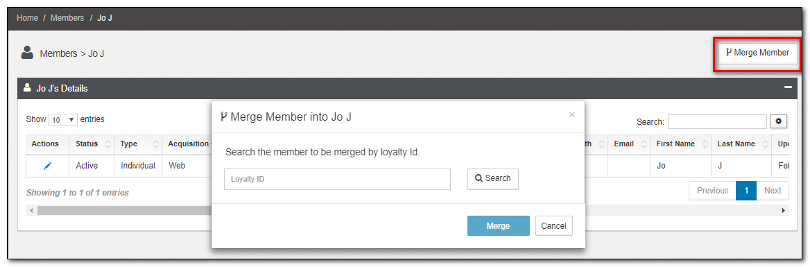 - An account is eligible for a merge if someone enrolls in the same Program twice using different Loyalty IDs and accrues points in both the member accounts associated with those loyalty IDs. The Merge Member can be used to fuse these two accounts into one.