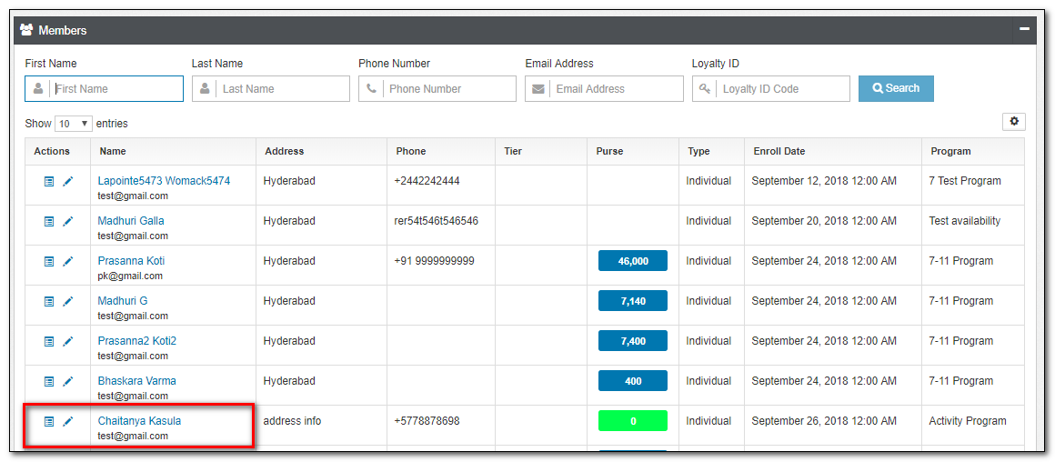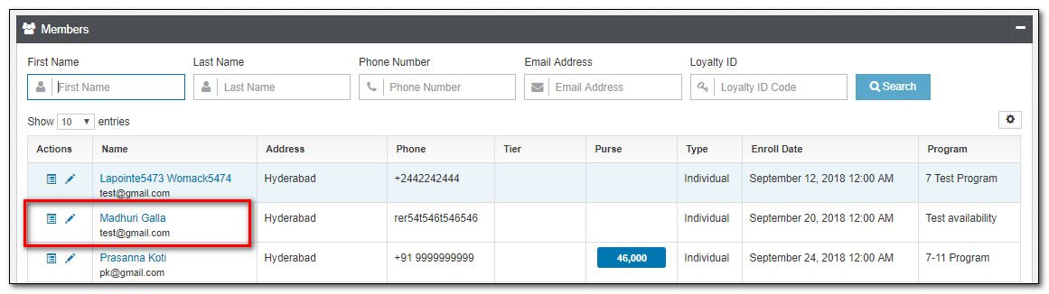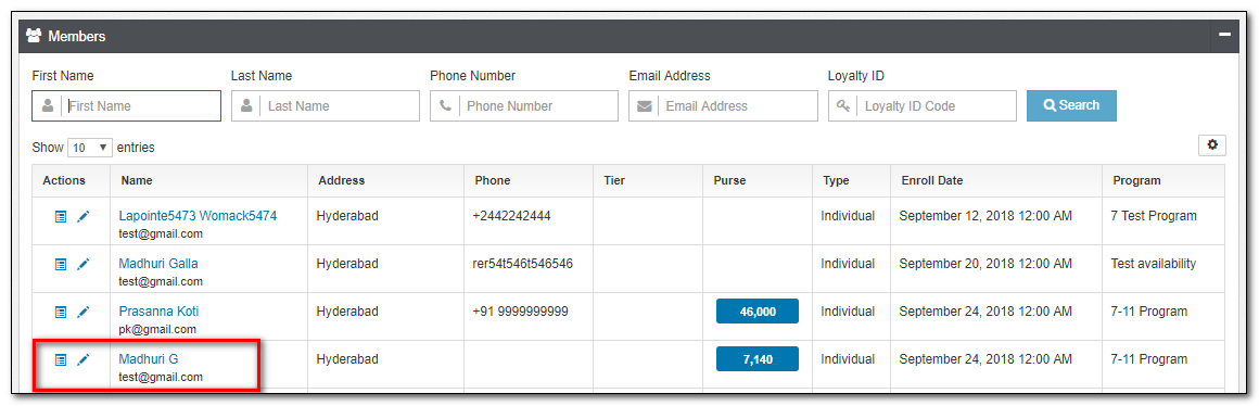 email id:John.J@gmail.com - Loyalty Id: type the Loyalty ID of the member you are trying to locate. For example,