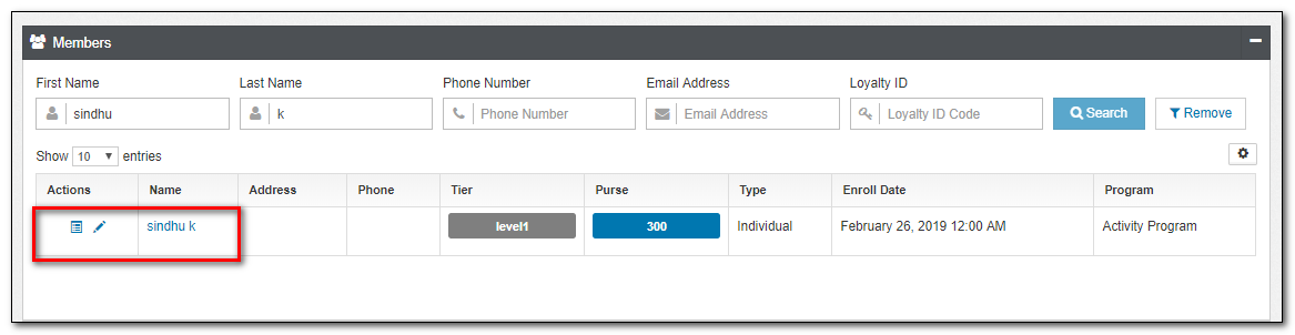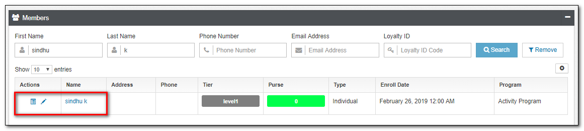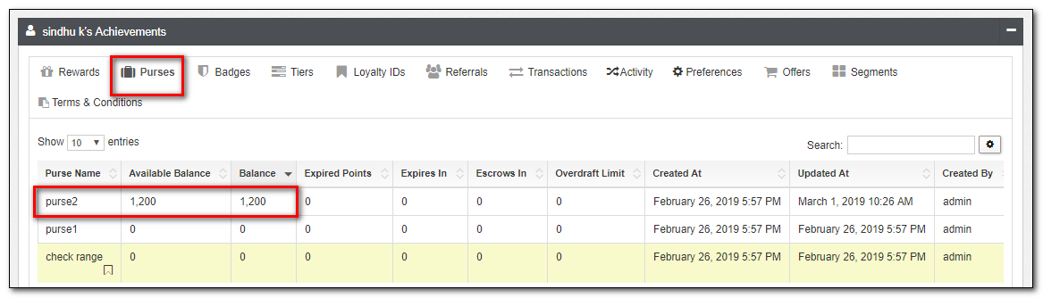 10.Click the Purses applet tab to check the Enrollment Bonus points and Referral Bonus points added to the member.