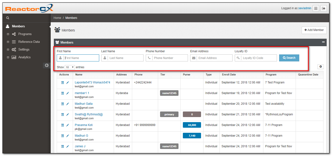 The Member List View in the home screen of ReactorCX you will be able to search several different ways.