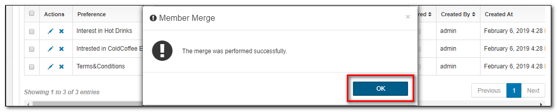 3.Click Merge/Cancel to Merge or discard your changes. A pop-up message displays as The merge was performed successfully. Click OK.