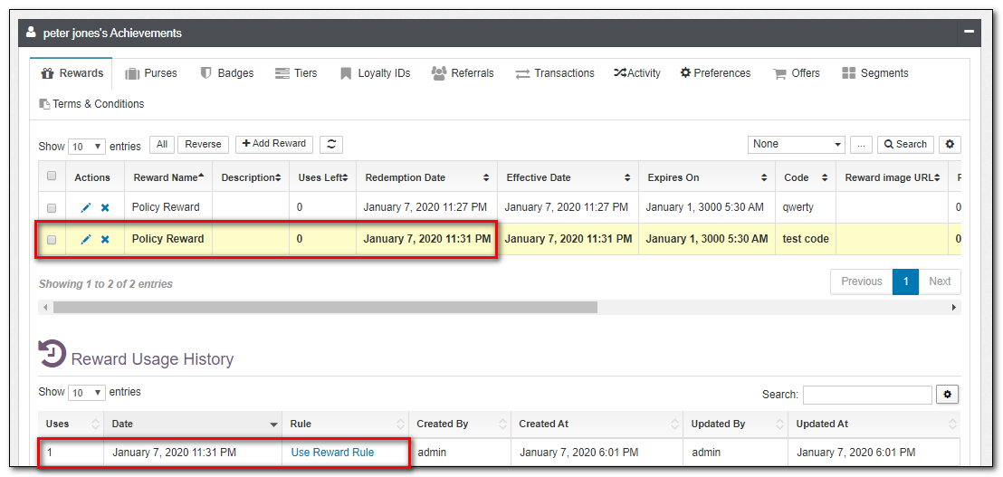 | Rewards | This a list of member Rewards, expiration status, and uses left. Rewards can manually be edited from this view. |