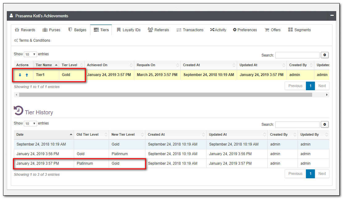 | Tiers | This is a list of Tiers, as well as their associated current level. You can upgrade/downgrade tiers from this view. Tier history is also shown in this view, indicating when tiers changed. |