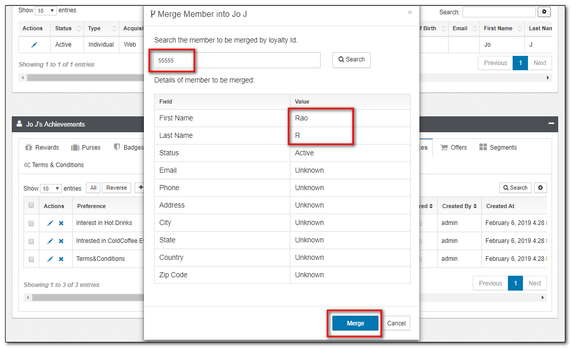 2.Enter the Loyalty ID of the Victim and click Search button. It displays with the details of the member to be merged.