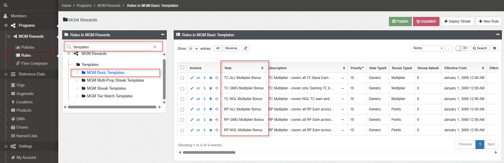Templatesfolder. One or more templates are listed. - Click the desired templates folder. The rules for the template are listed in the Rules table on the right.